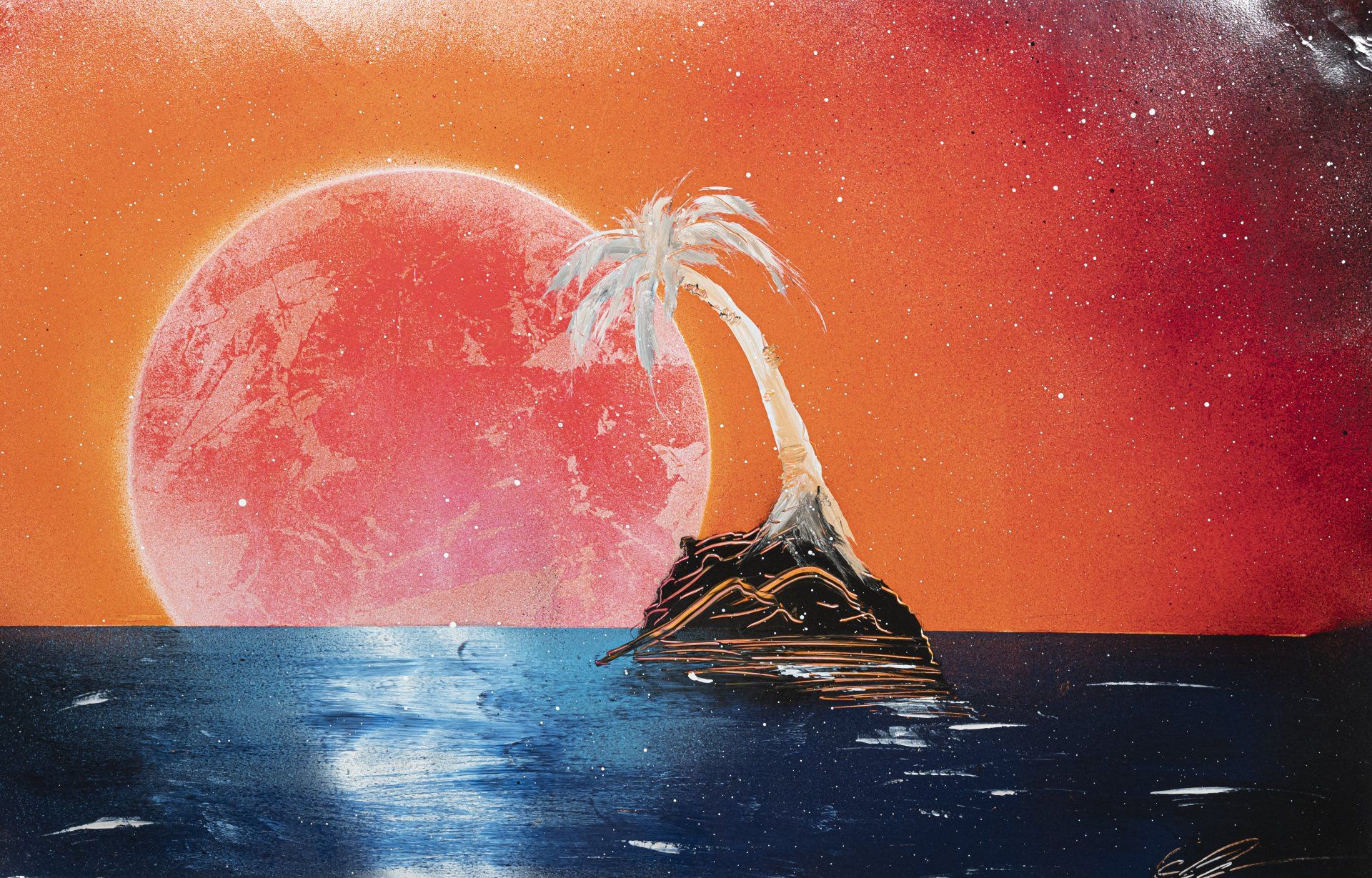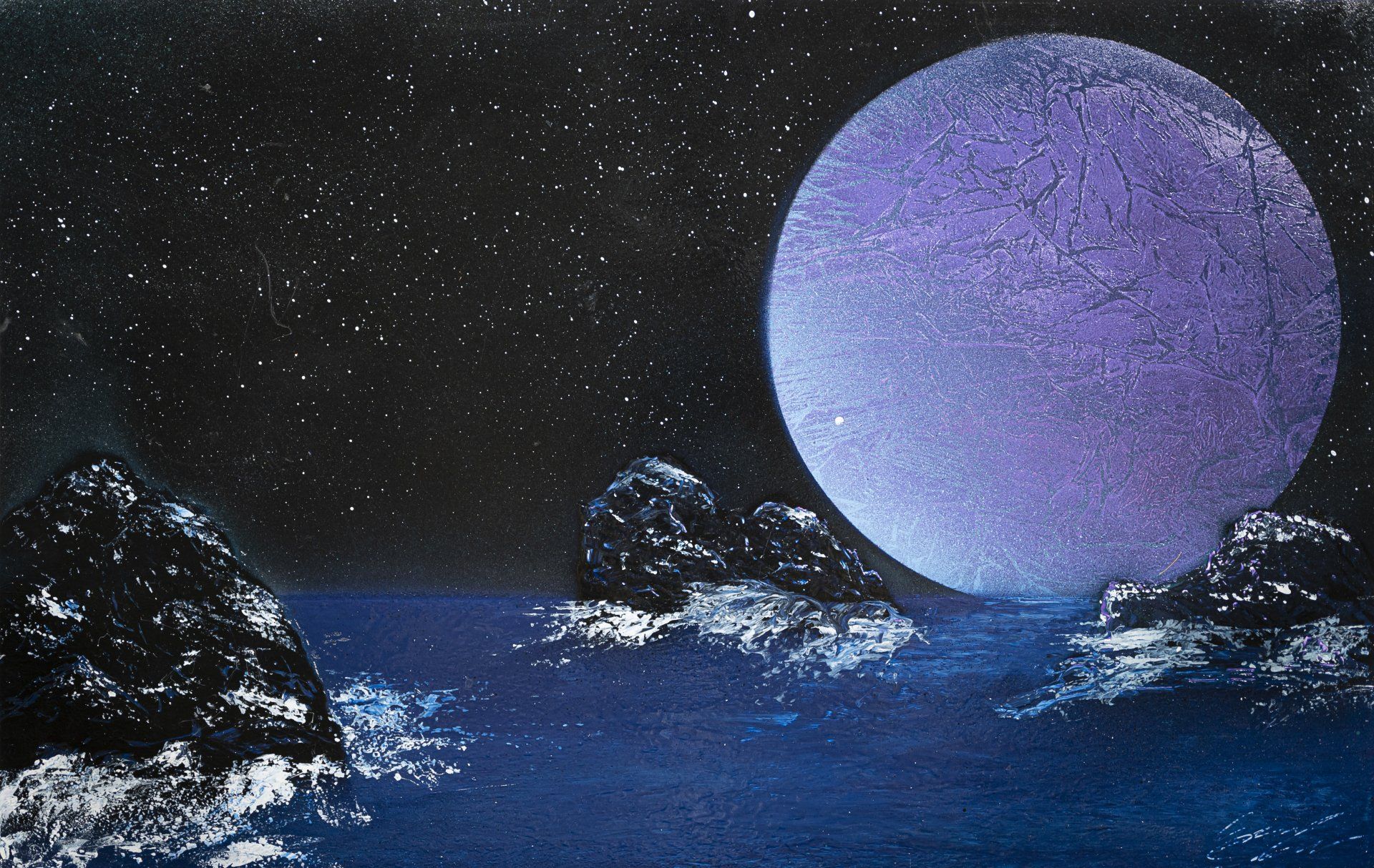 the medium of spray paint. I was exposed to a certain technique of using spray paint to create incredibly vivid depictions of landscapes with dynamic galaxies and planets filling the sky.